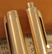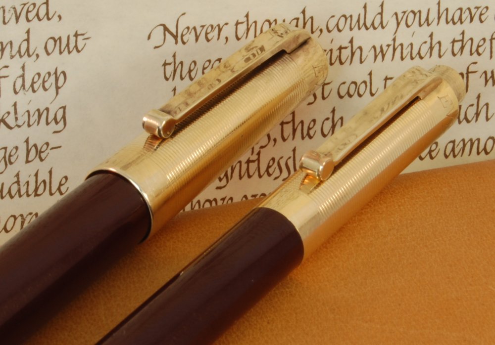 1946 Eversharp Fifth Avenue Ballpoint and Pencil set in Burgundy A very mint set. Horizontal ribs on the gold cap are still crisp. Est Value: $125 (not for sale; item shown for identification/reference purposes only) |