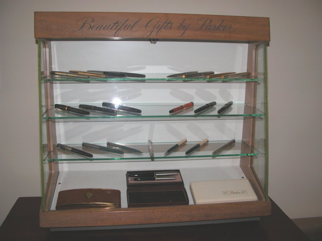 1960's Parker Pen Display Case With inscription "Beautiful Gifts By Parker" across the top. The back panel locks the upper 3 glass shelves. Plus a small hinged panel on the lower back allows unlocked access to the bottom shelf. Est Value: $250 (not for sale; item shown for identification/reference purposes only) |
